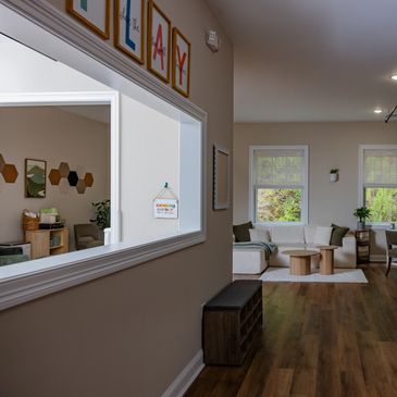 The space includes two connected yet distinct rooms: a calming lounge with standard height as well as high-top tables, soft seating, and warm neutral tones, alongside a climate-controlled play area filled with safe, soft equipment for kids to explore. A large interior window and open doorway connect the two, so parents and caregivers can